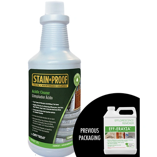 STAIN-PROOF® Acidic Cleaner, formerly known as EFF-ERAYZA™, is a new technology acid cleaner for removing efflorescence, rust stains, limescale, grout haze, mortar mess and fireplace soot. Acidic Cleaner is very powerful and generally more effective to use than traditional industrial acids but does not produce noxious fumes, non-corrosive to metals (except for uncoated aluminium) and temporary contact does not burn skin.
